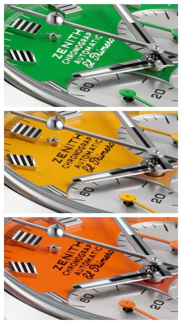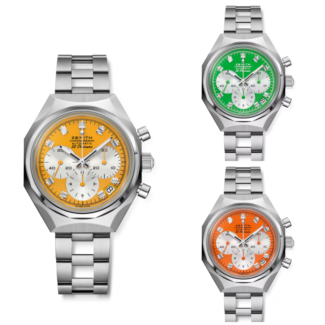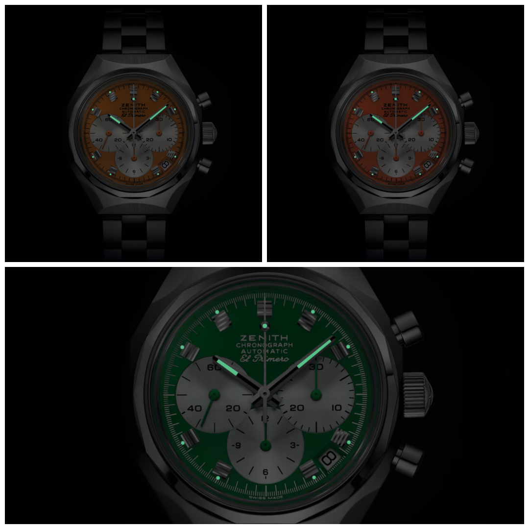 Each dial is a study in precision: three silvered subdials, grooved square hour markers, and a playful touch with a USM-inspired ball joint at the tip of the chronograph hand that glows with Super-LumiNova. Activate the chrono, and you’ll see the hidden Zenith star come alive beneath the sweep.
