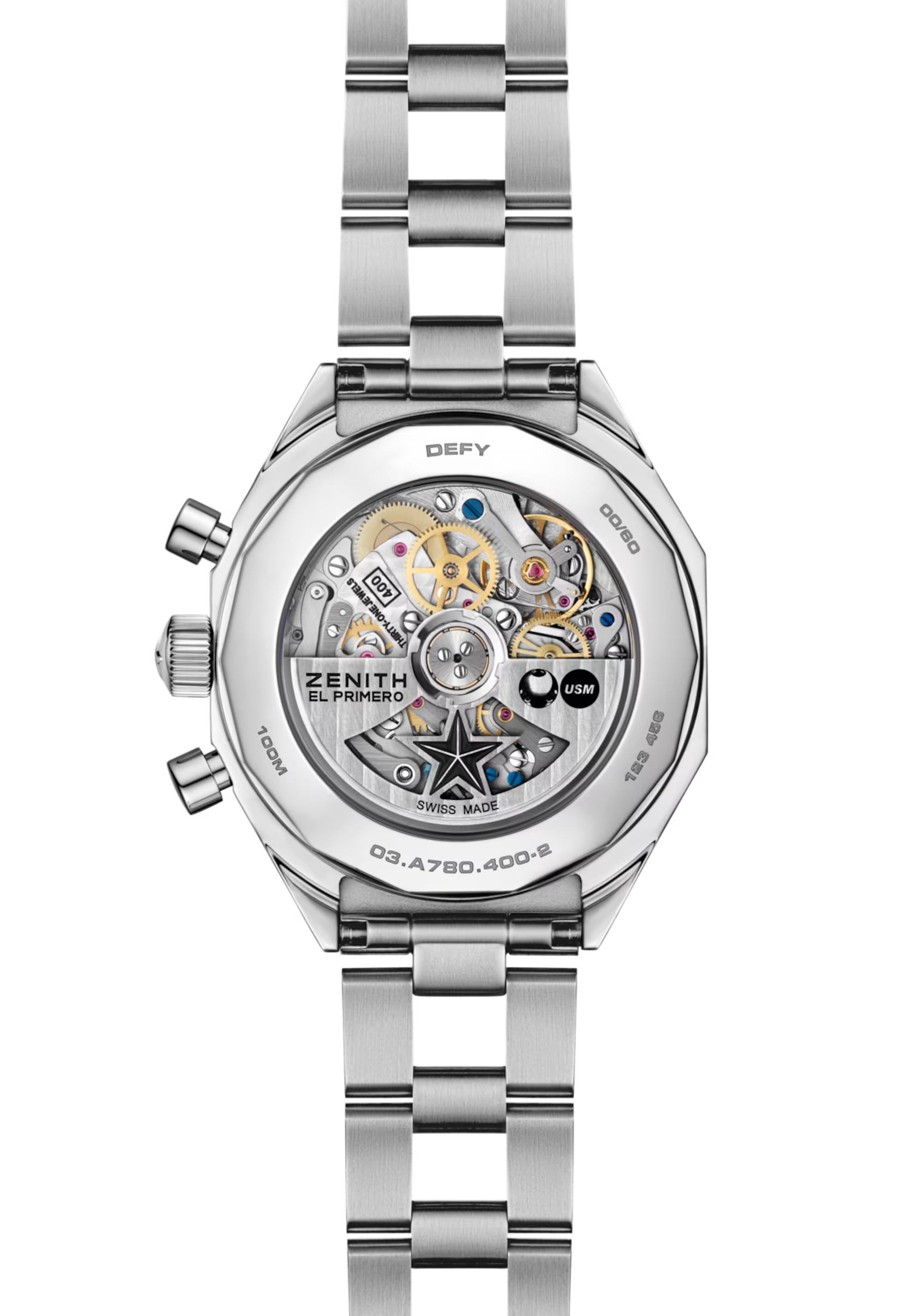 Inside this striking watch beats the heart of an icon: the El Primero 400 calibre, a direct descendant of Zenith’s legendary 1969 movement, famous for being the world’s first high frequency automatic chronograph. Delivering up to 55 hours of power reserve and featuring a silicon escape wheel and lever for durability and anti-magnetic resistance, this movement is as reliable as it is refined. Through the sapphire case back, you’ll spot the openworked rotor engraved with the Zenith star and USM logos, a beautiful nod to craftsmanship and collaboration.